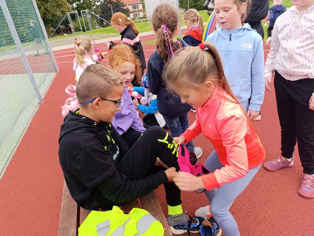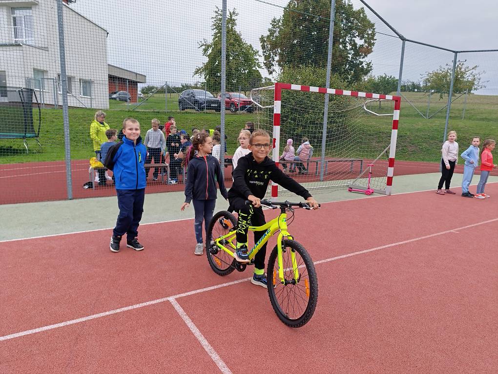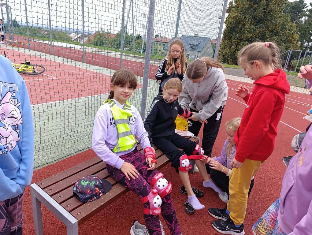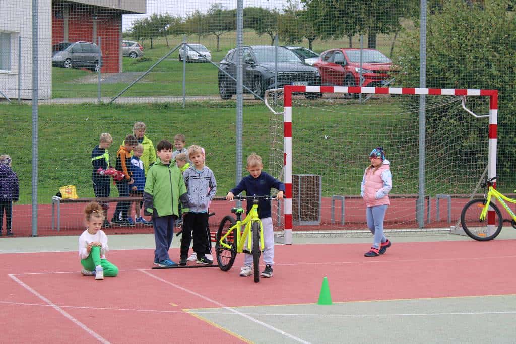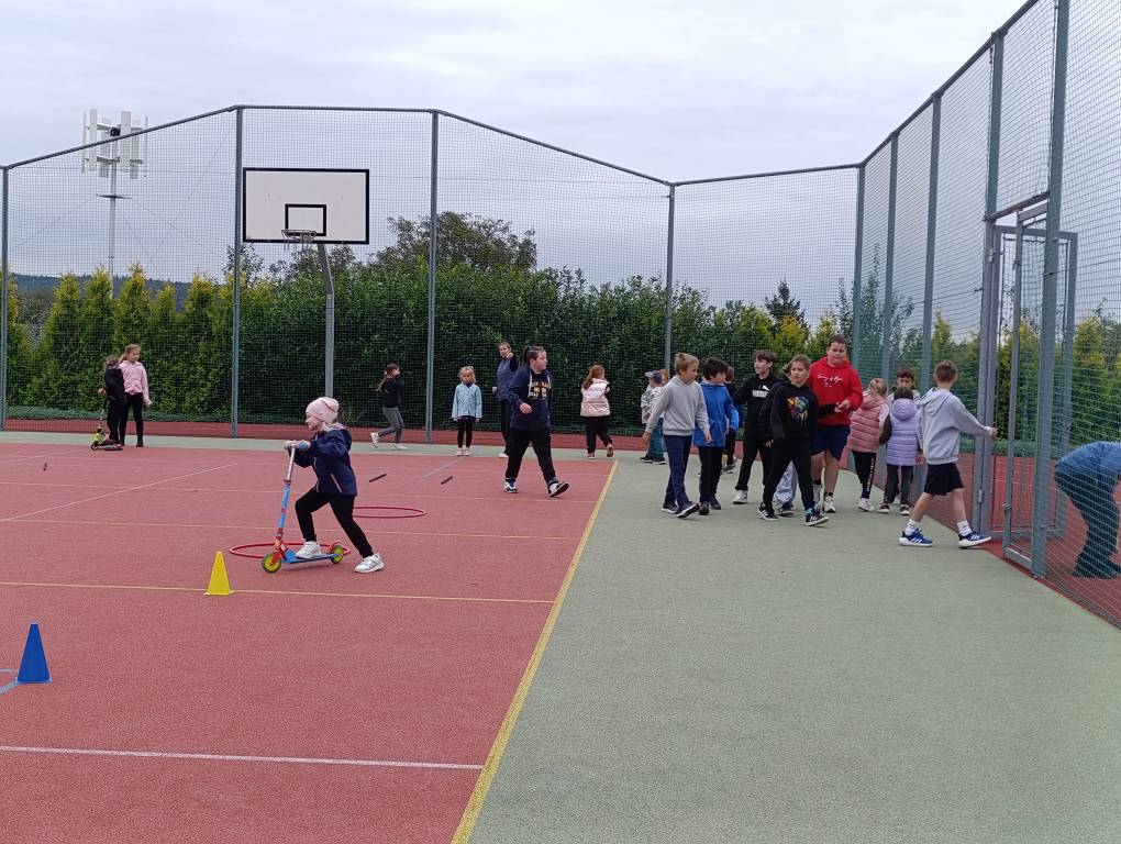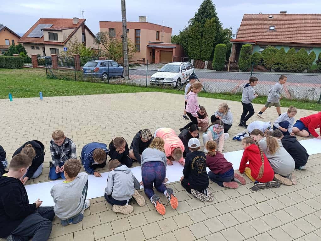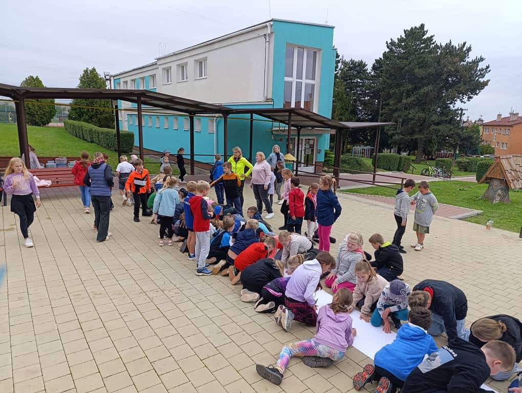 Ve čtvrtek 18.9. 2025 si žáci prvního stupně užili projektové dopoledne. Bylo to vyvrcholení celého týdne, kdy v rámci projektu „Pěšky do školy“ vyměnili pohodlí aut rodičů za vlastní pohon a chodili do školy pěšky, na kole, či koloběžkách. V rámci projektového dopoledne se poprali s úkoly, které pro ně byly připravené, a vyzkoušeli si tak bezpečnou jízdu na kole, slalom na koloběžce, poznávali povinnou výbavu cyklisty, nebo se naučili první pomoc při drobných úrazech. Na závěr všichni pustili uzdu své kreativitě a vytvořili společné dílo, kdy na dlouhý papír kreslili cokoli, co je napadne, když řekneme slovo „doprava“. I když na závěr spadlo pár kapek deště, tak si všichni akci užili a snad se i přiučili něčemu novému.
